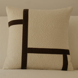 Cushion made of bouclé fabric with hazelnut-coloured velvet ribbon.