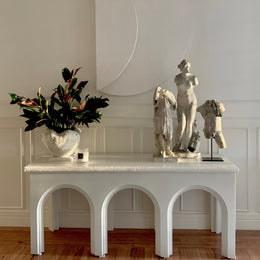 Consola de diseño de tres arcos lacado en blanco mate y con y tapa en acabado de estuco.
