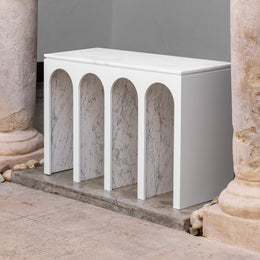 Original consola de arcos con acabado en laca y tapa de mármol. Terminación en calacatta en la cara interior de los arcos.