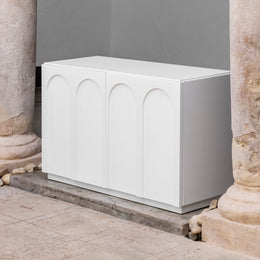 Exclusiva cómoda de dos puertas con acabado en laca y posibilidad de diferentes terminaciones de los arcos en papel de algodón, calacatta o roble.